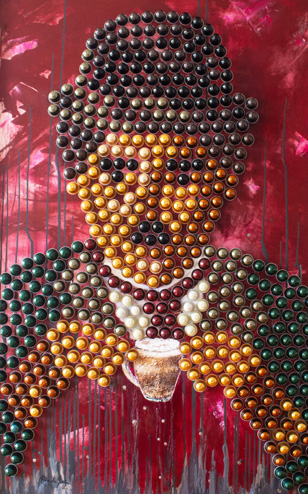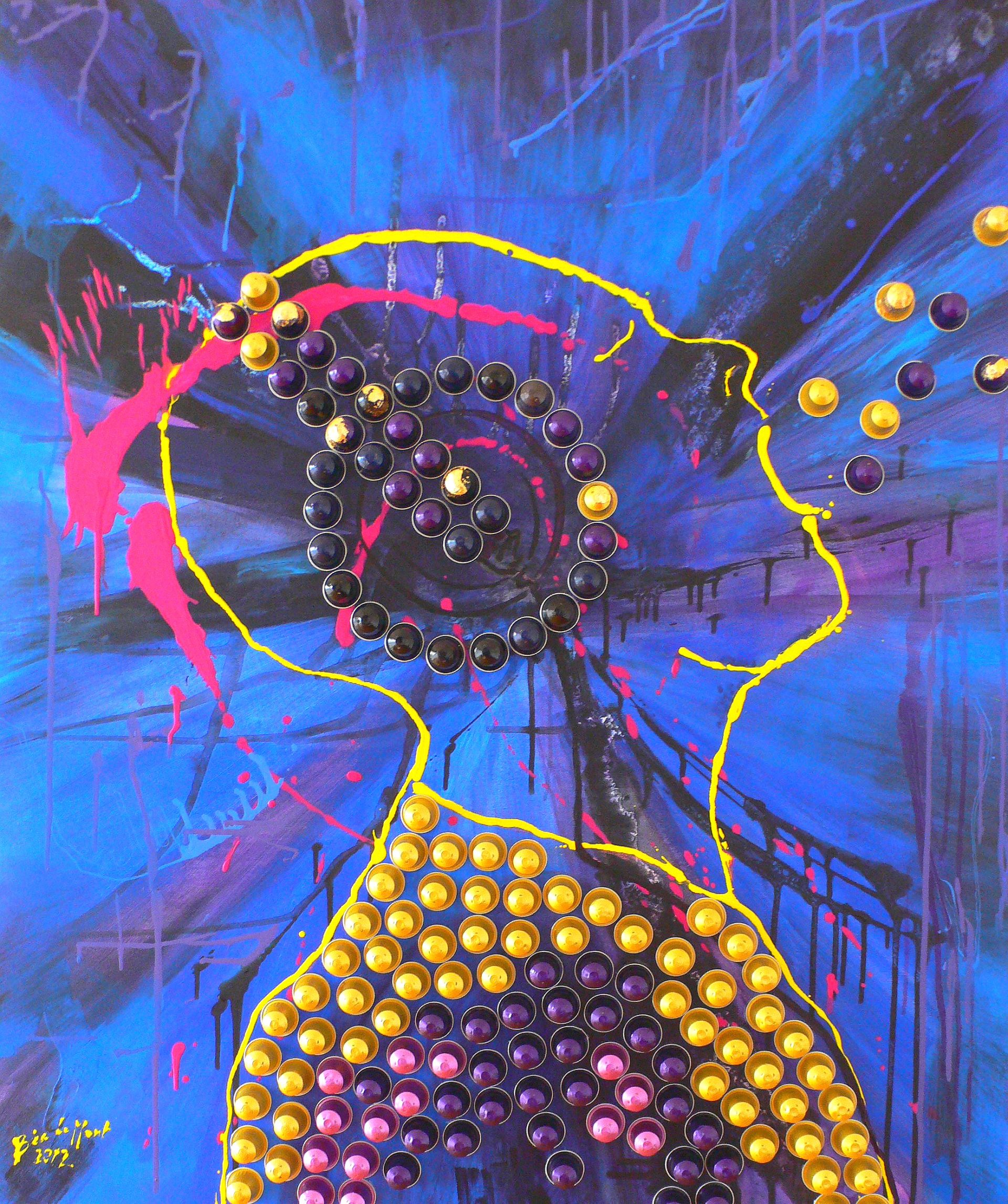 Mime, 102 x 152 cm, huile sur toile et capsules recyclées, encadré. Oeuvre unique. Disponible CHF. 50.--/mois