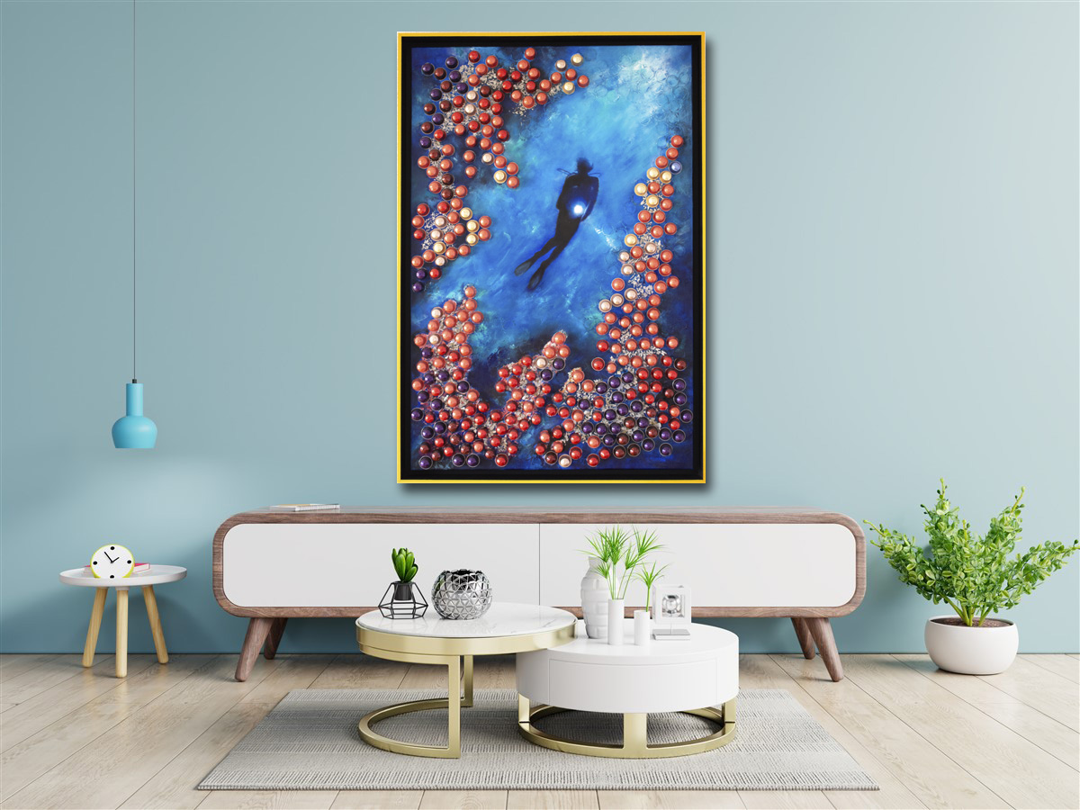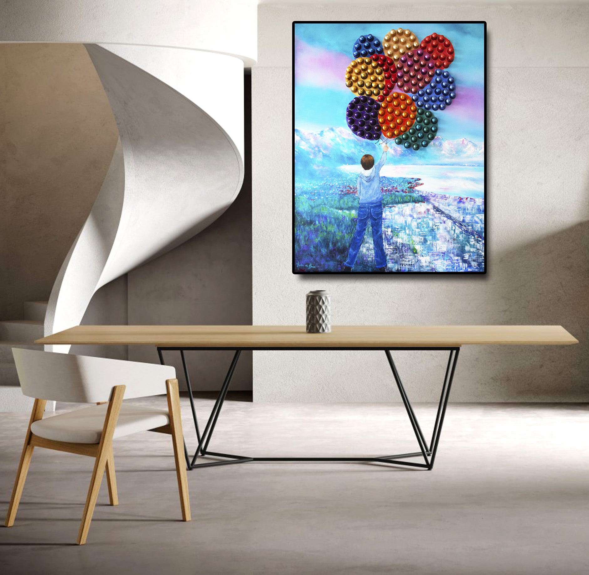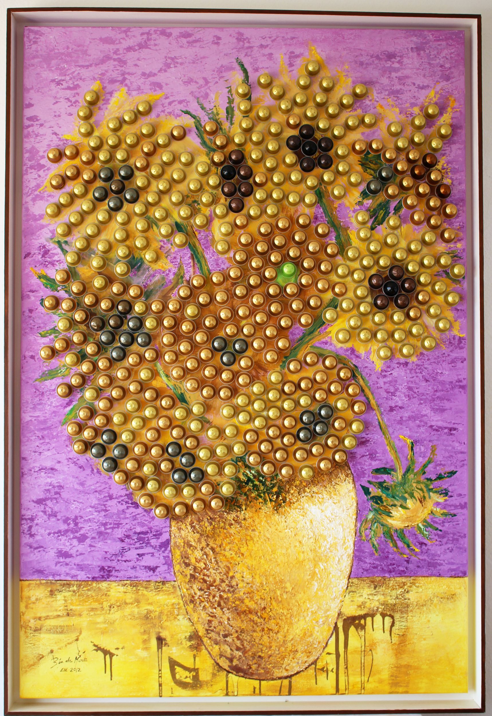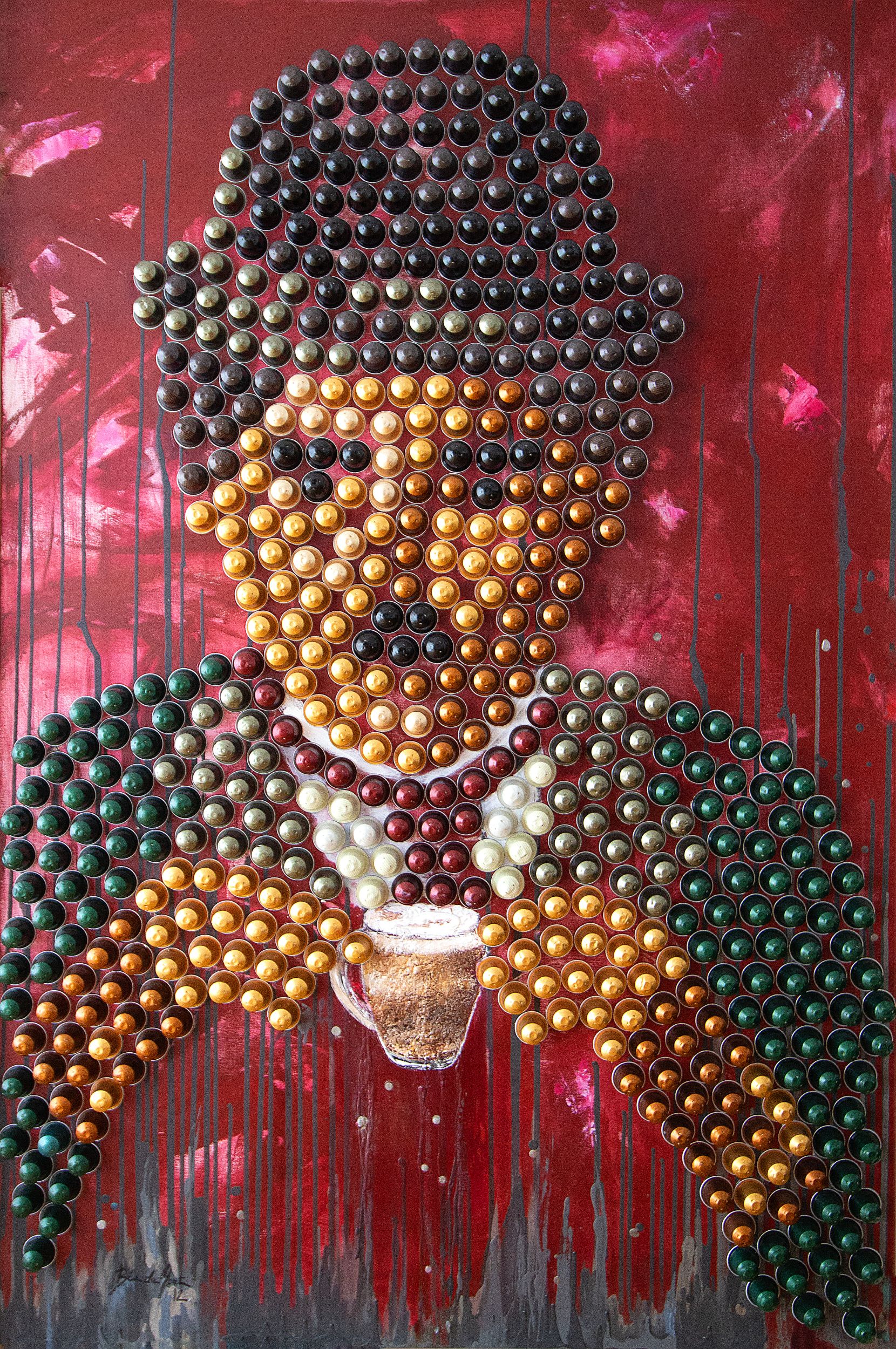 Fleurs du soleil, 102 x 152 cm, huile sur toile et capsules recyclées, encadré. Oeuvre unique. Disponible CHF. 60.--/moisCharlot, 102 x 152 cm, huile sur toile, capsules recyclées. Encadré. Oeuvre unique. Disponible CHF. 60.--/moisTalons aiguilles, 100 x 39cm, huile et capsules recyclées. Oeuvre unique. Disponible CHF. 50.--/moisMime, 102 x 152 cm, huile sur toile et capsules recyclées, encadré. Oeuvre unique. Disponible CHF. 60.--/moisLes Ames soeurs, 101 x 152 cm, huile sur toile et capsules recyclées. Oeuvre unique. PlacéeLe garçon aux ballon, 127 x 105 cm, huile sur toile, capsules recyclées. Encadré. Oeuvre unique. Disponible CHF. 60.--/moisBlue Electric, 86 x 127 cm, huile sur toile et capsules recyclées, encadré. Oeuvre unique. Disponible CHF. 60.--/mois