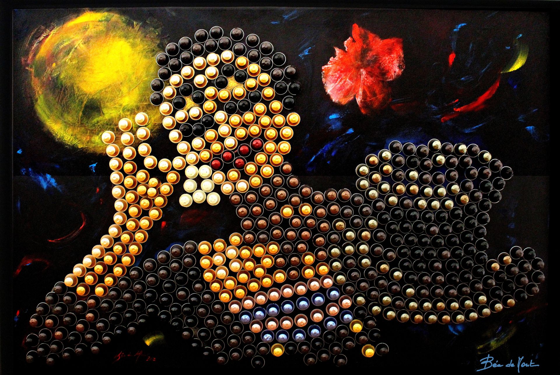 Les âmes soeurs, 152 x 101cm, huile et capsules recyclées, encadrée. Oeuvre unique. Placée CHF. 50.--/mois