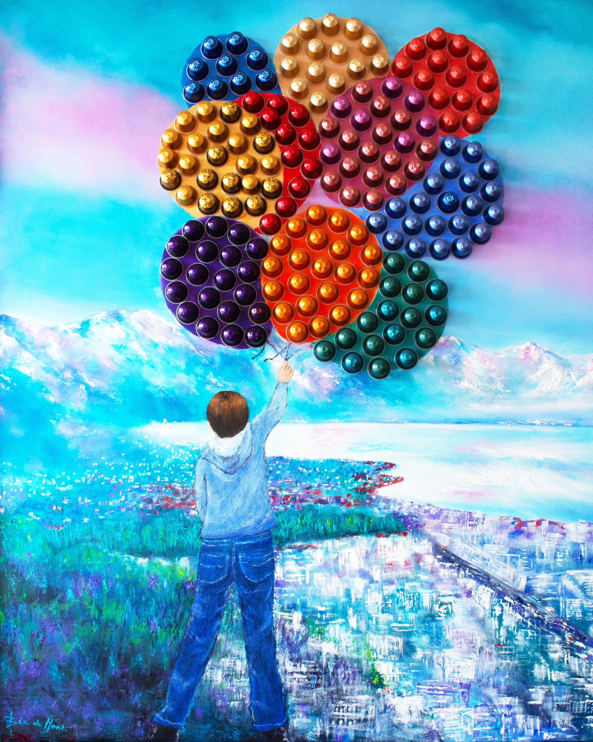 Le garçon au ballon, 127 x 105 cm, huile sur toile, capsules recyclées. Encadré. Oeuvre unique. Disponible CHF. 50.--/mois